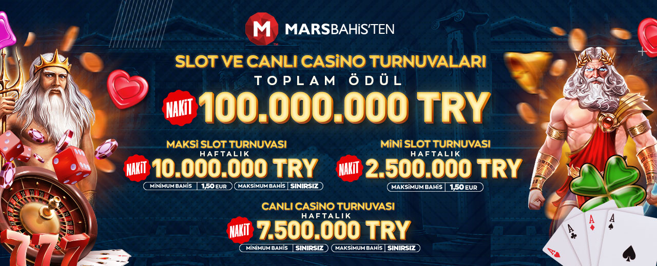 Her hafta Maksi Slot Turnuvası ile 10.000.000 TRY, Mini Slot Turnuvası ile 2.500.000 TRY ve Canlı Casino Turnuvası ile 7.500.000 TRY Nakit Çevrimsiz ödül!